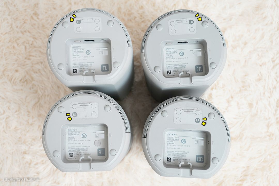 每个音响底部分别有对应的位置标记,按大概方位摆放即可,相较于传统回音壁,灵活度高了很多。