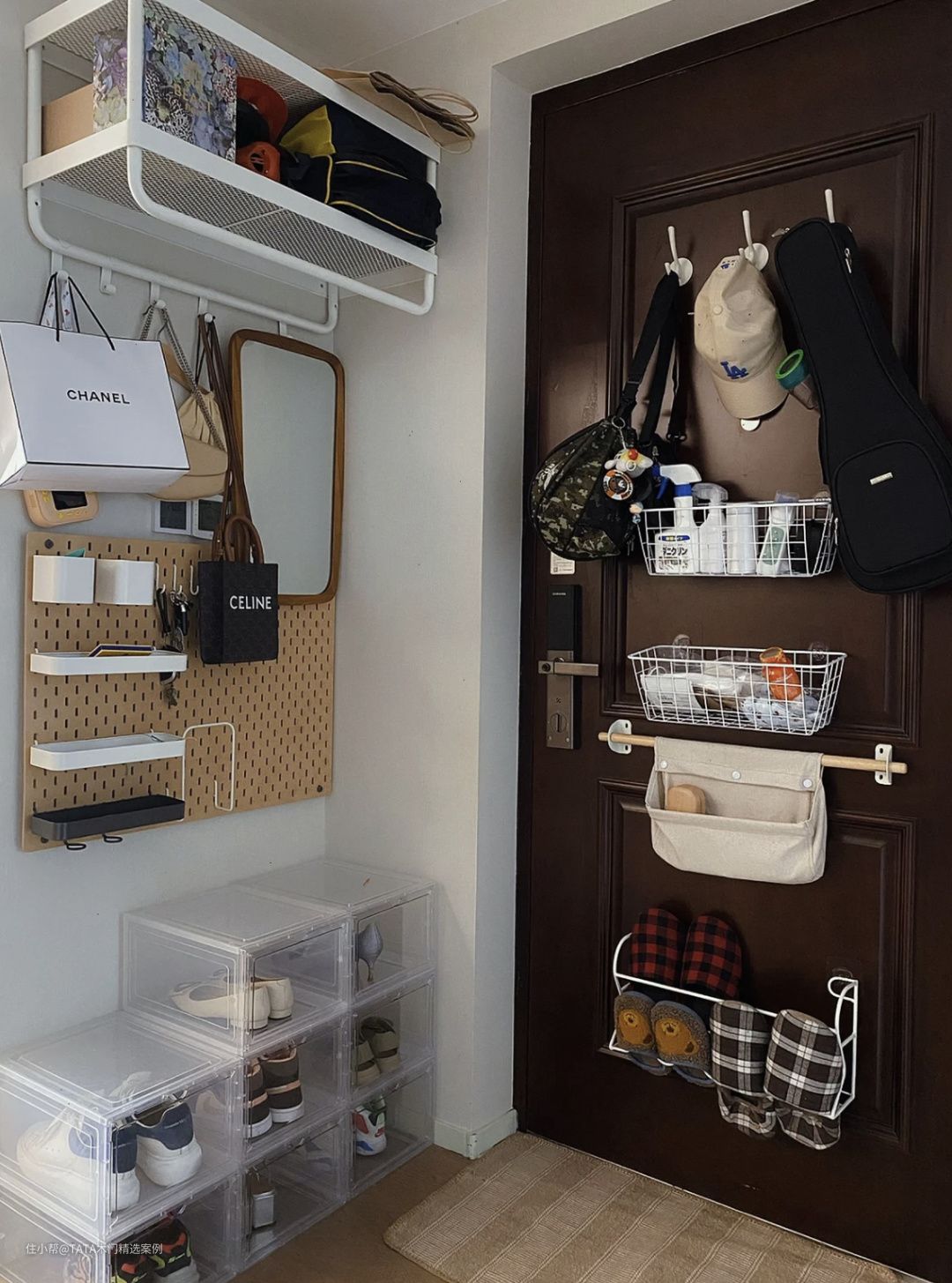 门后不足1㎡的空间,在业主们脑洞大开下被用到了极致。挂钩、挂带、收纳筐,包包、帽子、脏衣物,简直是万物皆可挂上门。