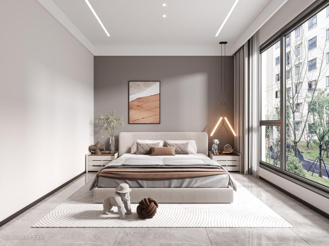 卧室是一个比较私密的空间,主卧的设计简约大方,主卧以灰白作为主色调,床头配绿植和造型别致的金属元素吊灯,充满了艺术气息。利用大面开窗,达到观景、引光效果,光影交织下的韵律,让室内阳光满溢。渲染出逃离紧张的烦嚣,感受休憩空间舒适的意境。