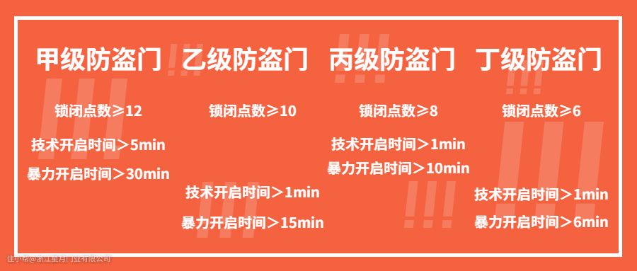 在防盗门内页刻印甲字钢印,是按照国家最新标准《防盗安全门通用技术条件》来做的。标准中将防盗门分成了四个等级:甲、乙、丙、丁。每个等级的对应标准不一样,四种等级里,甲级是防盗门的天花板哦!