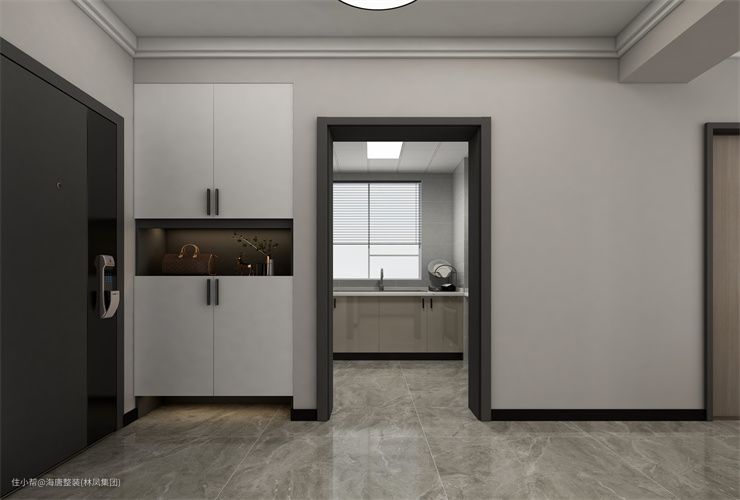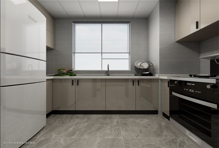 厨房地砖连接着客厅,比较好打理,而且节省砖的损耗,柜体呈现暖灰色,和墙面的冷灰色形成鲜明对比,看着比较高档。