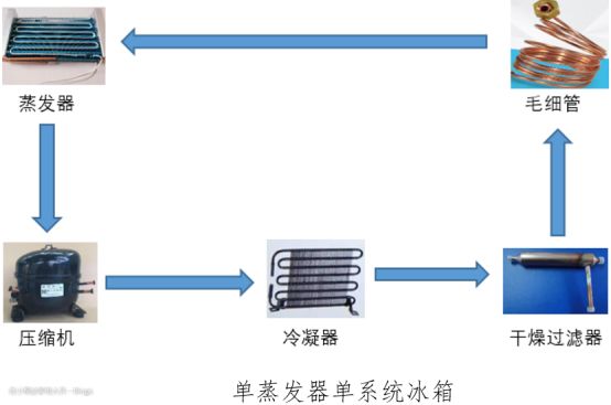 此类冰箱的制冷剂循环按照:压缩机—冷凝器—干燥过滤器—毛细管—蒸发器—压缩机,这就是一个典型的制冷剂单系统循环,俗称单系统。