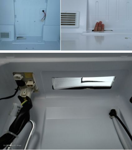 上图为冷冻室和变温室之间的风道,降温原理和冷藏室一样,都是通过冷冻室的冷风来降低变温室的温度。