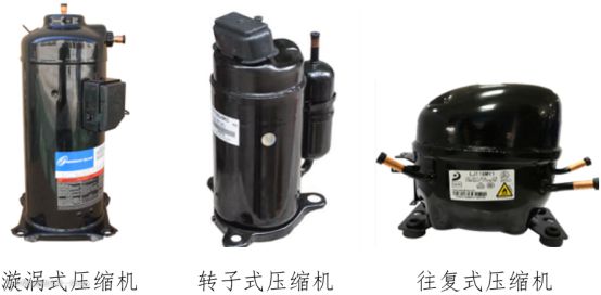 跟空调器不同,大匹数中央空调多使用涡旋式压缩机,小排量的家用分体式空调多采用转子式压缩机;而家用冰箱多采用往复式压缩机。