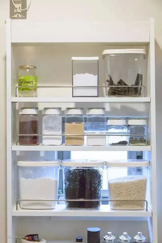 调味品、粉剂、干菜等配料和干食品,可以用透明瓶分装。一方面颜值高,看起来很舒服;另一方面,它可以随时掌握余量,对自己的厨房状况了然于心。