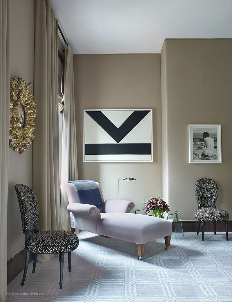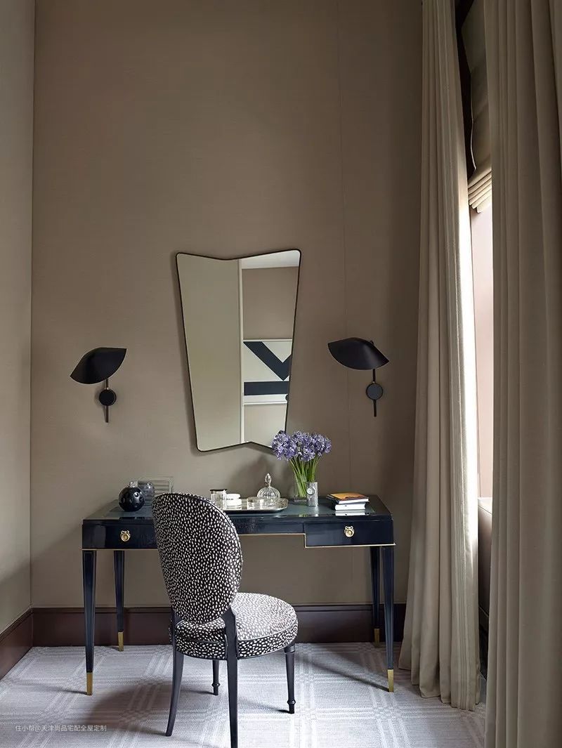 窗帘的图案选择不宜过于复杂,白色底衬保持整齐感,灰褐色将轻奢气质彰显,简约设计将功能性最大化彰显。