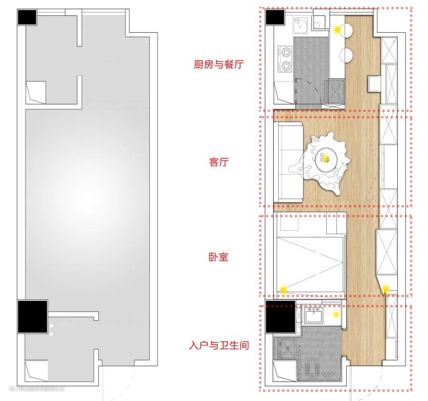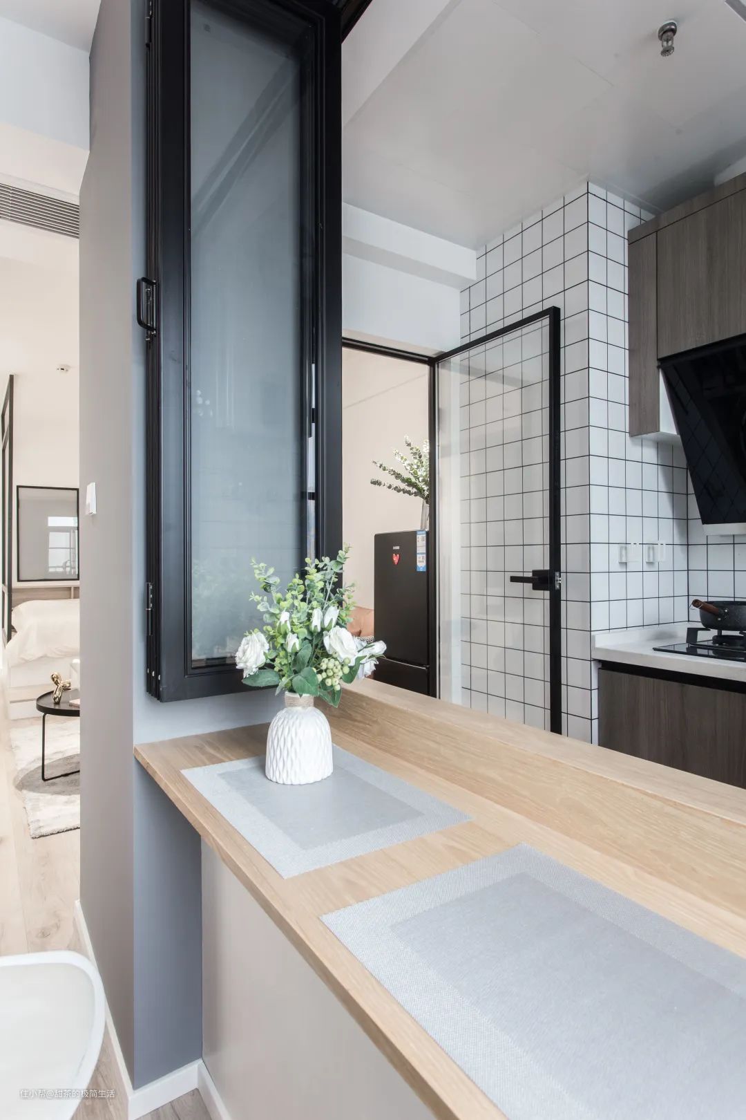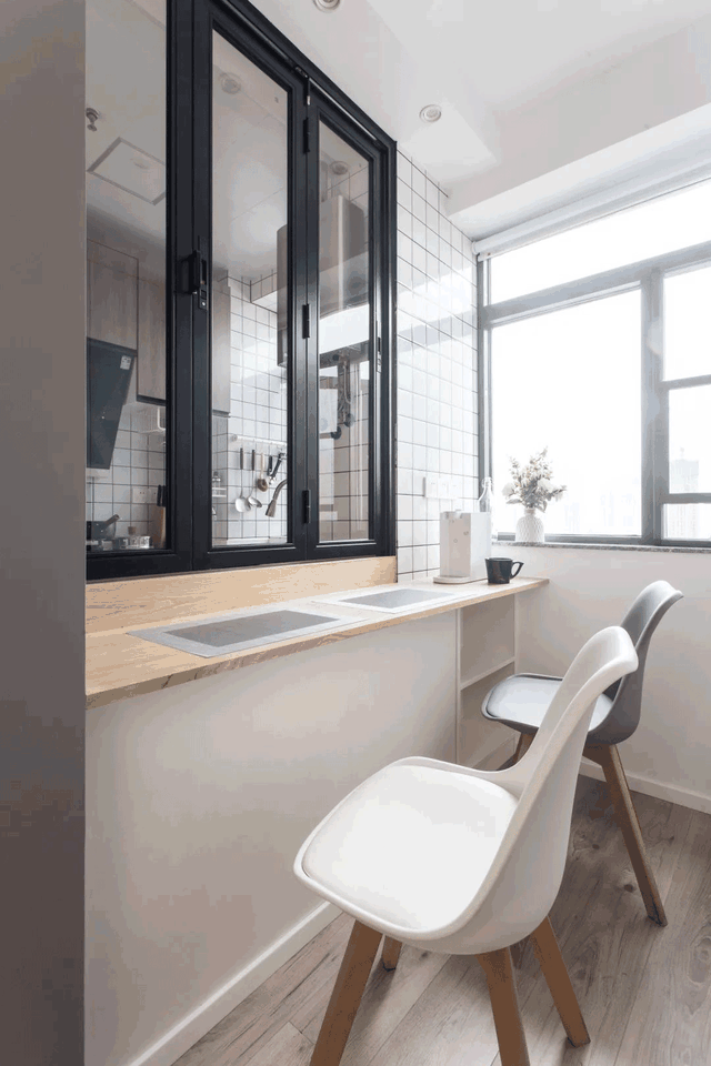③更改厨房入口,在侧墙增设“室内窗+吧台”,以实现餐厅的功能。
