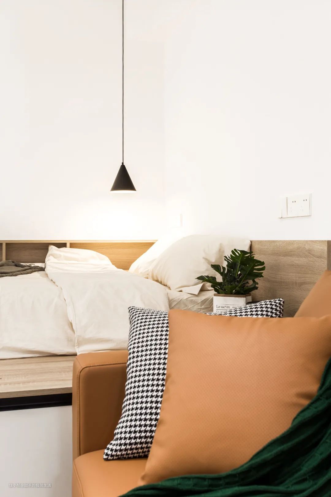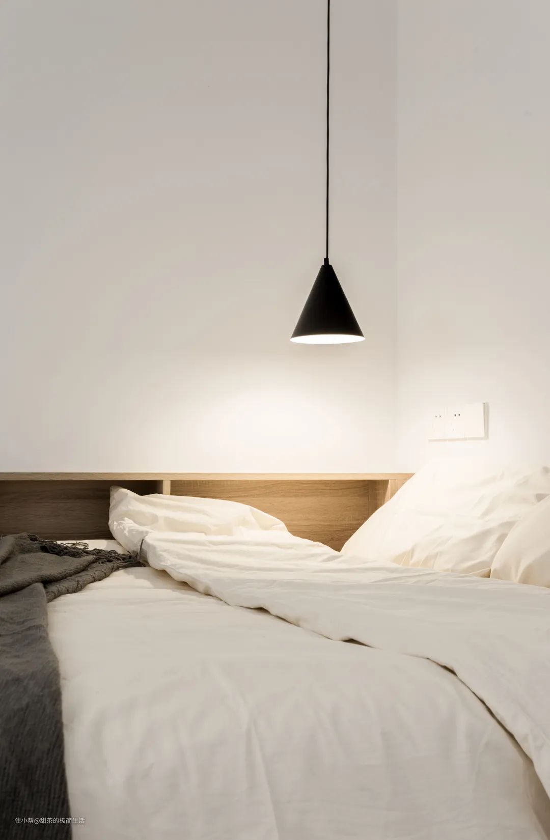 床头用木饰板做装饰,上方预留了开关和插座,简洁又实用。