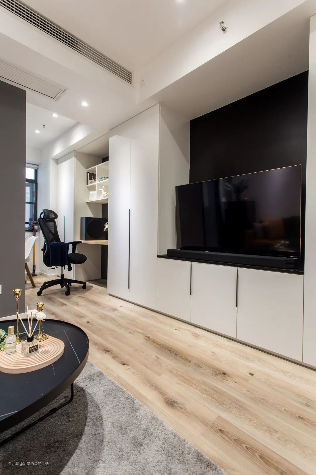 纯黑色的电视背景墙,和白色柜体形成撞色对比,简约又不失质感。