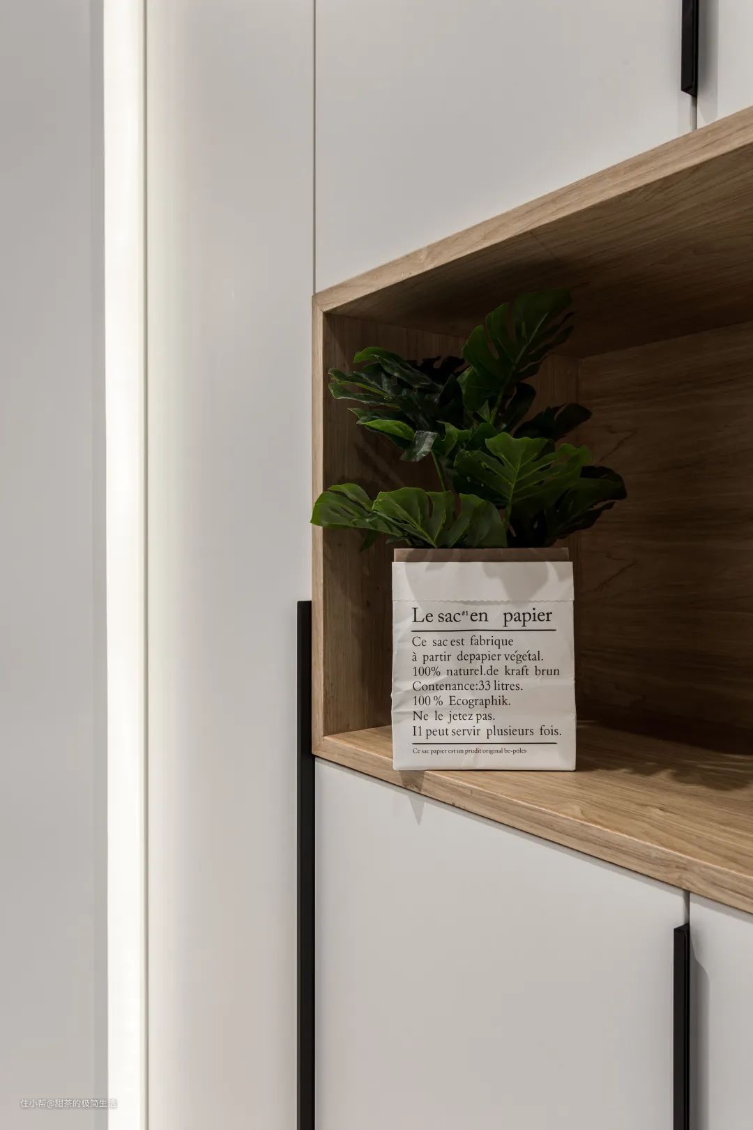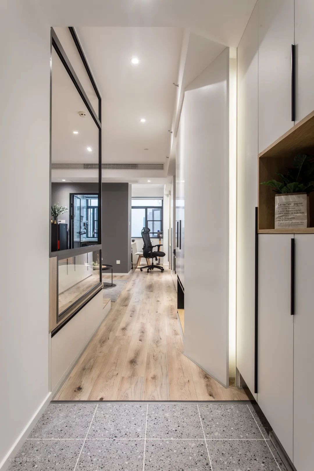 设计师在玄关的右侧,定制了顶天立地的“三段式”收纳柜,兼顾了储物和展示的功能。