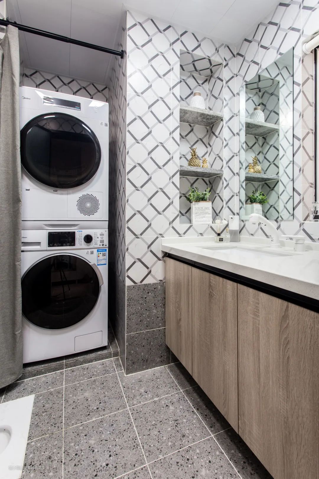 卫生间内除了常规的功能外,还安排了洗衣机和烘干机,两件大家电叠放在卫生间的角落里,并用防水布帘做隔断,以避免潮湿。
