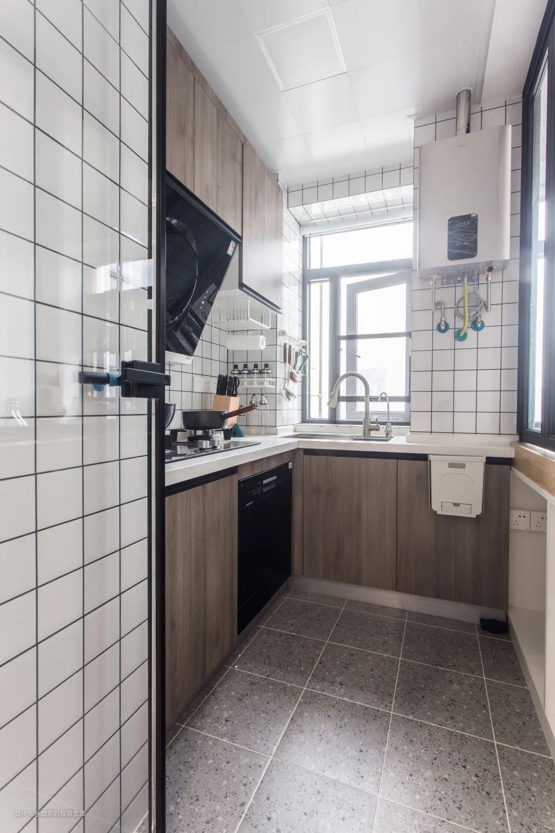 厨房在房子的最内侧,紧挨着阳台,原本只有一面小窗户。
