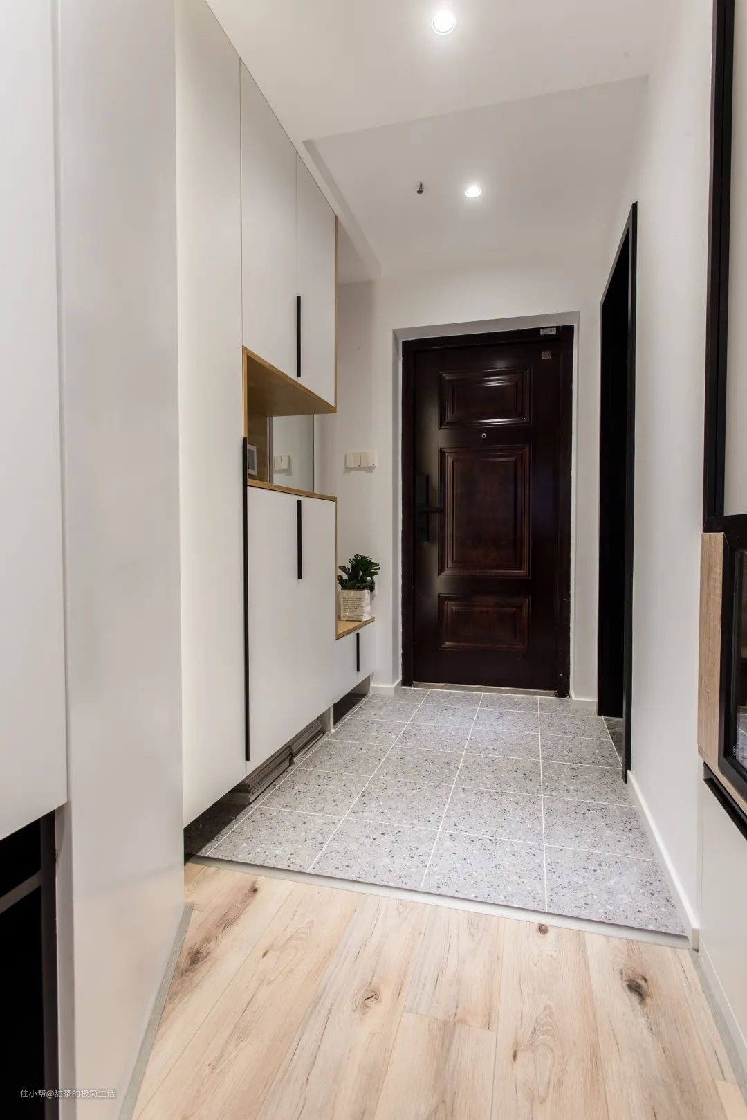 玄关区域的地面,铺了浅灰色的水磨石地砖,不仅与室内的木地板形成了区分,而且耐脏耐磨性更好,易于屋主日常打理。