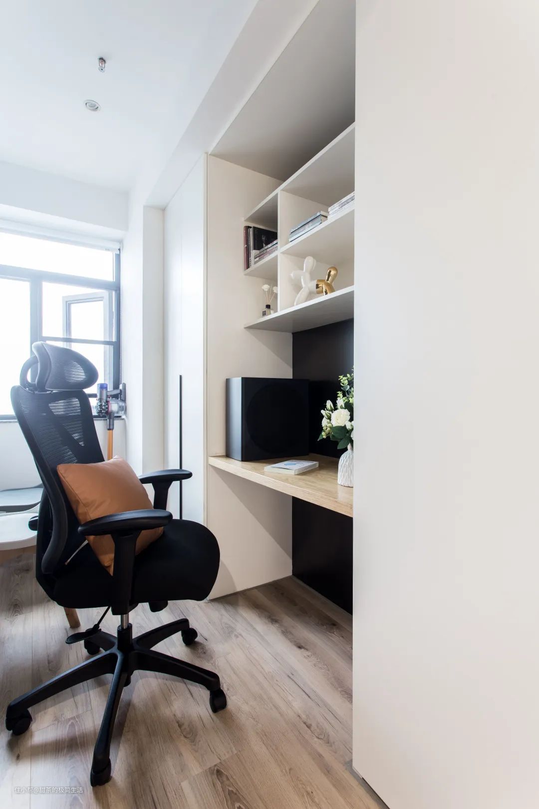 阳台是家里除了厨房以外,第二个采光区。设计师根据男主的需求,在阳台定制了“书桌+书柜”,可满足他日常办公和游戏的需求。