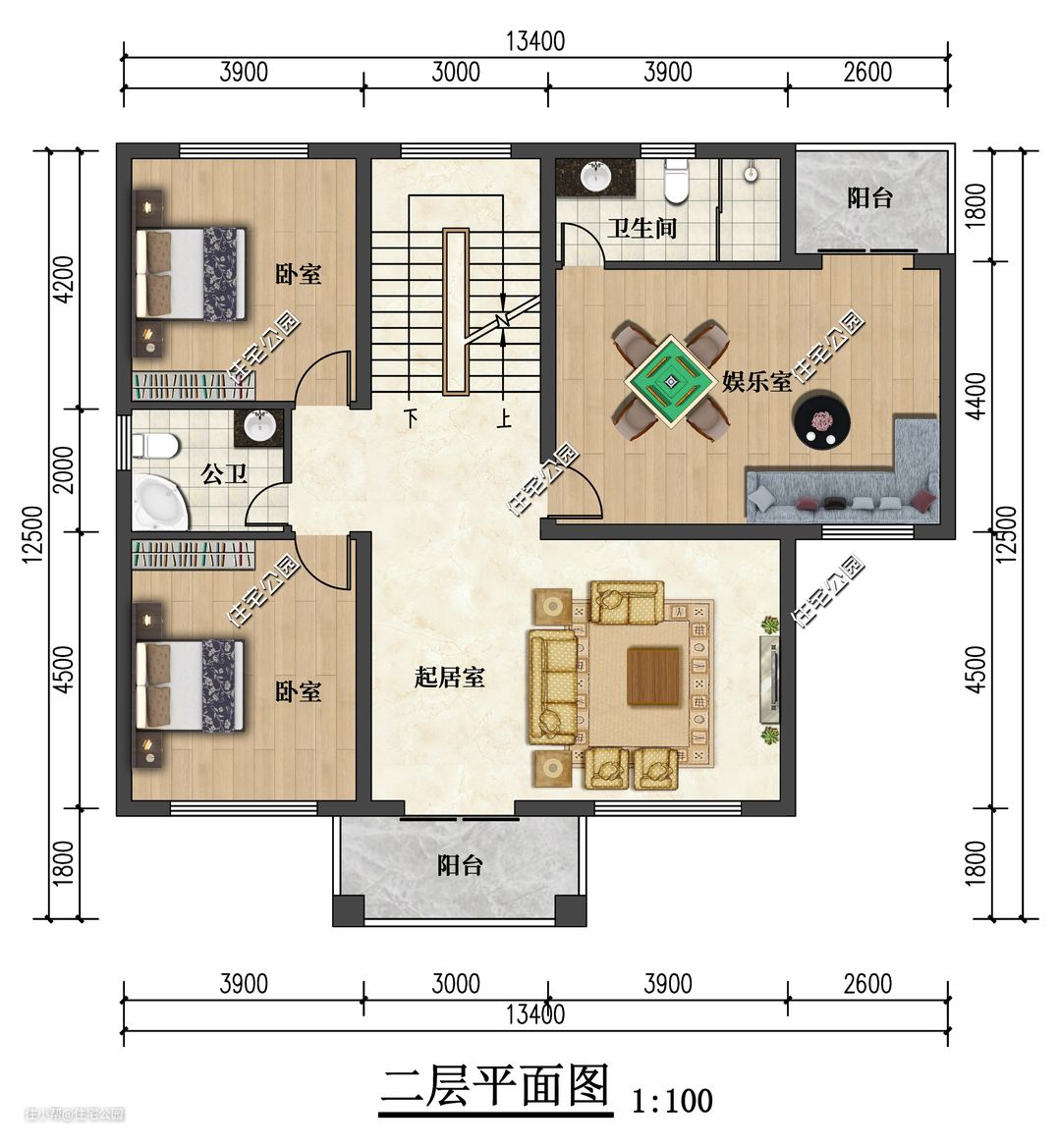 二层最大亮点是40平超大娱乐室,自带阳台和卫生间,放置转角沙发和麻将桌,休息、娱乐都满足。