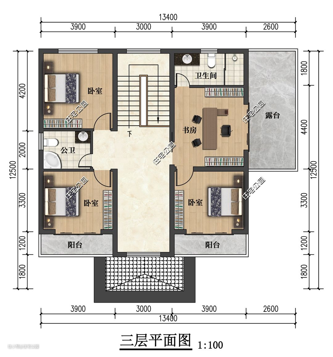 三层布局简约大方,3间卧室搭配一个书房,房子的接待能力、整体功能性都得到极大补强。穿过书房即为露台,学习、办公累了,拿着一杯清茶在露台上看看风景、吹吹晚风,劳逸结合,学习效率更高。