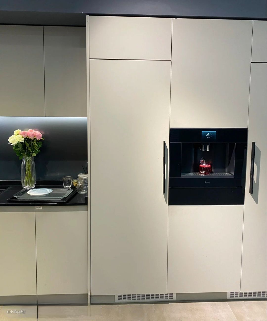 然后冰箱门也是装到柜门上的,跟定制的柜门一样,关上严丝合缝,不藏污纳垢,颜值特别高。
