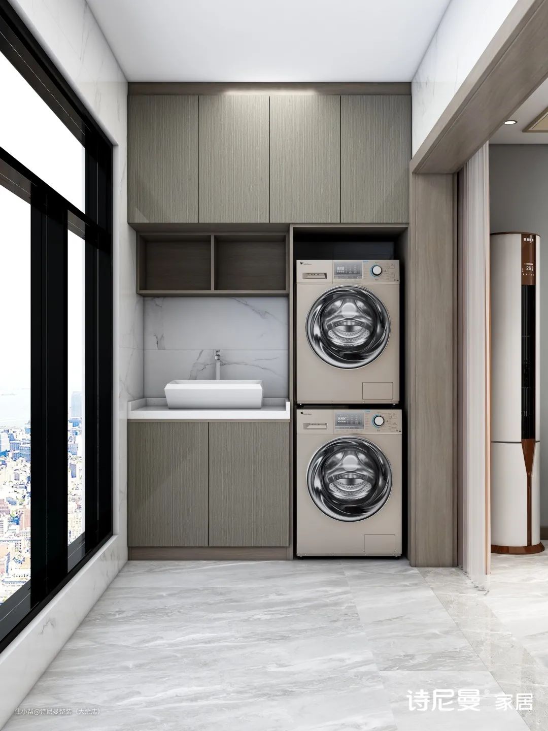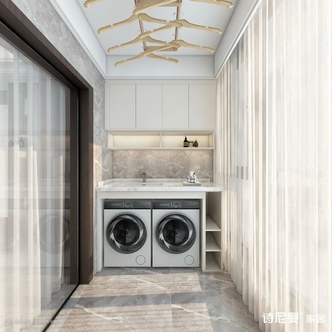 烘干机与洗衣机叠放,腾出更多收纳空间。