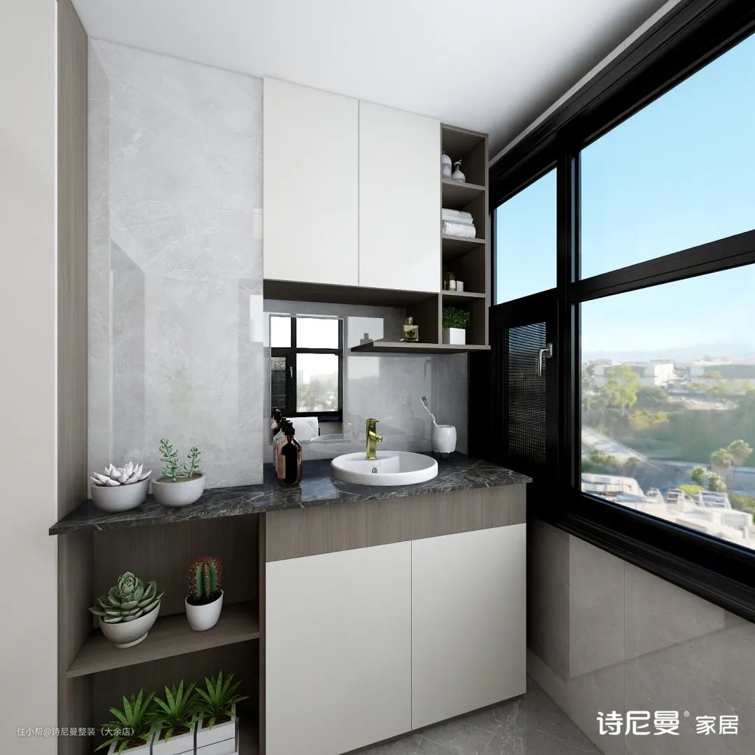 在保证洗漱晾衣等基本需求外,把冰箱搬进阳台,分担厨房的收纳压力。