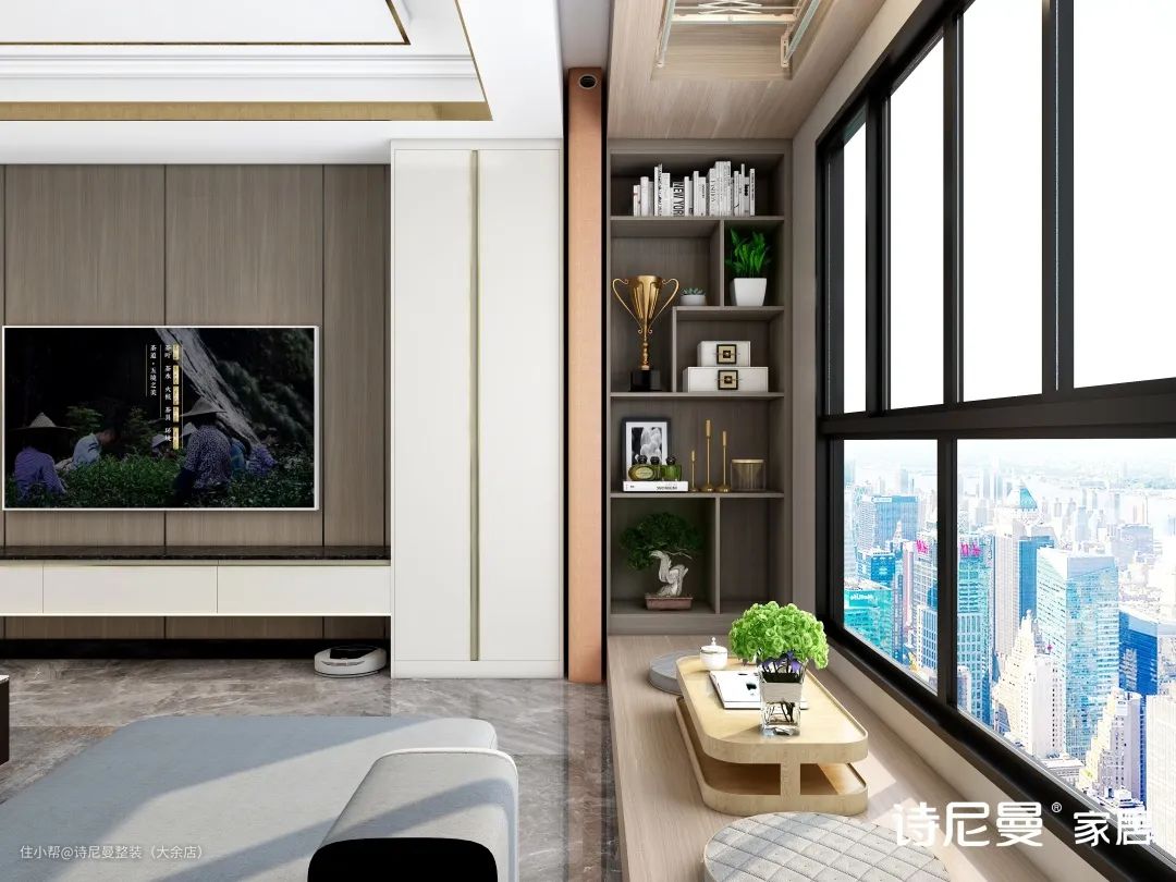 将电视柜设计延伸到阳台柜,让空间更加统一大气。