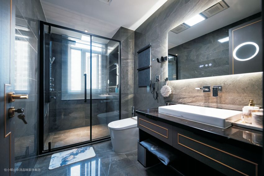 黑色可以作为卫生间的主色调吗?当然可以。案例中的卫生间就使用了深色的大理石地砖和大理石墙砖,利用明亮的灯光和大理石自带的天然纹理,营造出更华丽的卫生间空间。