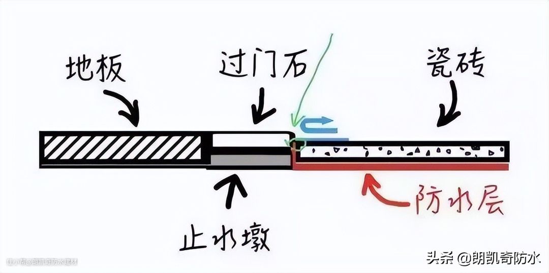 厨卫阳台与其他空间之间一般用门槛石分开,然后用朗凯奇堵漏王对门槛石和止水墩之间、以及过门石和门洞之间的缝隙进行填充,堵漏王干固后开始刷防水。防水要刷到门槛石和止水墩的交界线以上。