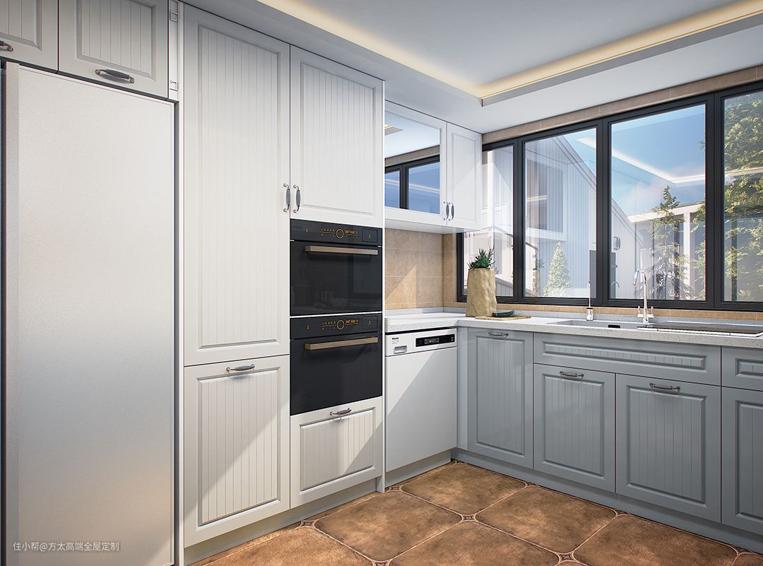 蒸箱、烤箱、洗碗机全部嵌入橱柜里,双开门大冰箱靠在同一侧,厨电集中安放,使用起来更方便。