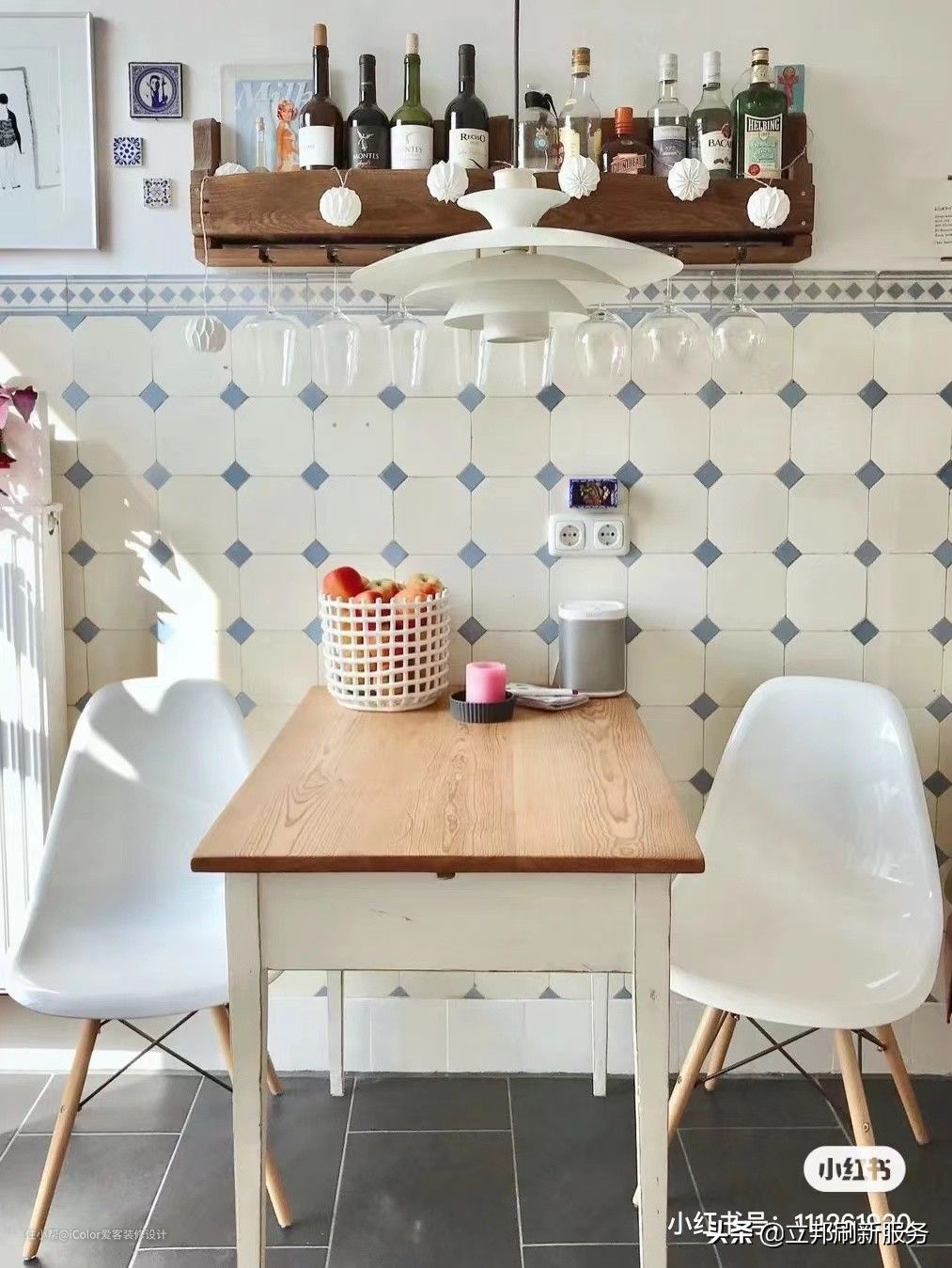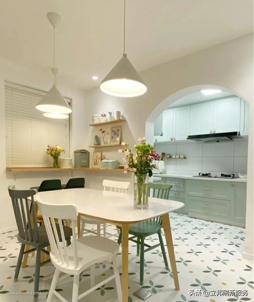 餐厅的用砖,也可以向厨房看齐,和客厅形成区隔,形成餐厨一体化视觉效果。比方说餐厅和厨房用同样的小花砖,客厅选用简洁大方的款式。像这套案例,厨房和餐厅地面通铺了300*300小花砖,墙面次啊用柔光纯白色300*600,效果反而十分出彩。