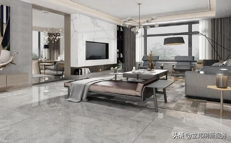 其次,瓷砖的大小尺寸来说,最好选大块砖,常用800*800mm,显大750*1500mm。要想客厅看起来高端大气,瓷砖的块面不能小。