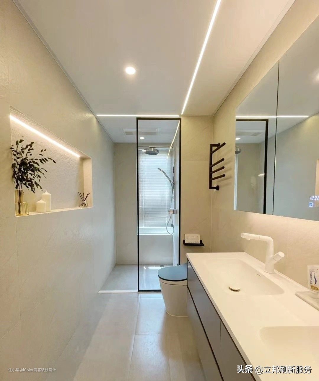浅米色,带有石材花纹的瓷砖,在灯带的映衬下也会显得很高级。