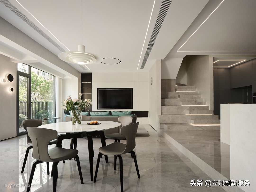 另外,就是选择颜色不那么明显,颗粒不那么密集的款式。然后其他部位可以用大块面的色彩来相配,弱化水磨石的存在感,这样两者搭配反而很协调。