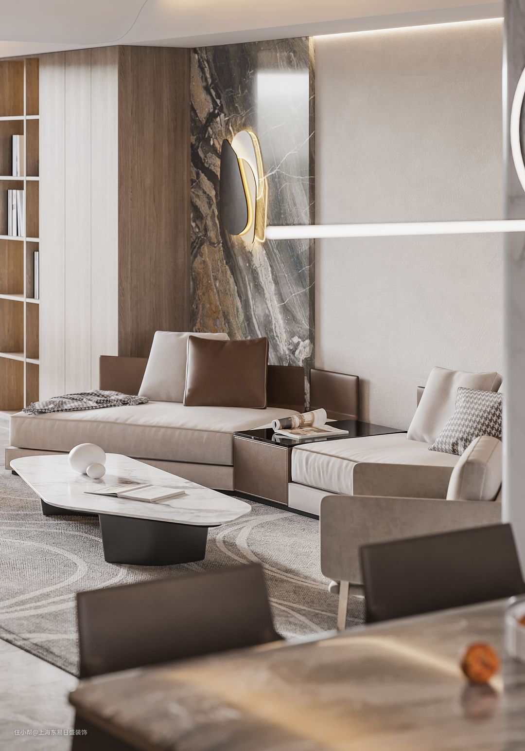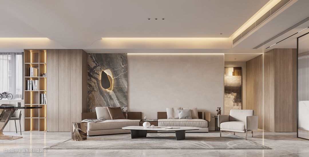 沙发毕竟墙利用大理石材质进行拼接设计,干净利落的灰色的大理石上,添加金属装饰以及灯带点缀,凸显质感大气的空间。平面吊顶搭配无主灯造型以及隐藏式灯带,敞亮大气。