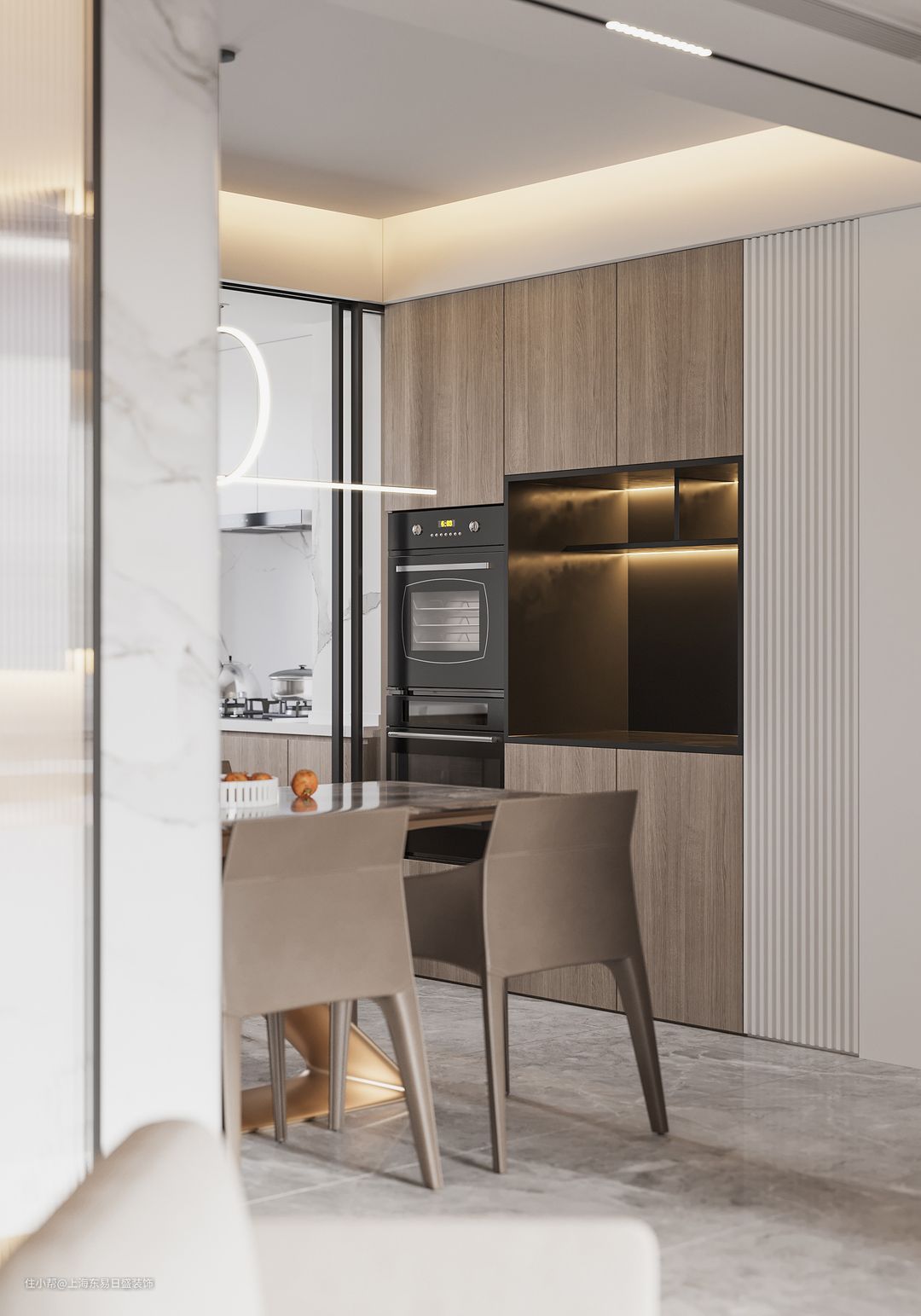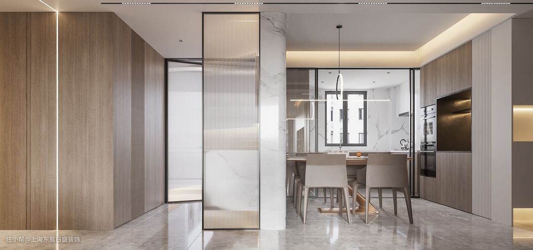 餐厅与厨房做半开放式设计,玻璃推拉门划分两个区域,不影响采光同时又能保证油烟味完全格局,木制餐边柜将大型家电做内嵌式处理,保证视觉上的利落简洁,同时也能分担厨房的储物压力。