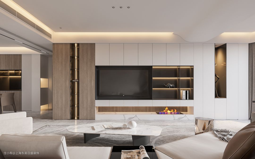 电视背景墙做整体橱柜,增加空间储物面积,隐藏式橱柜和开放式橱柜搭配,不管是装饰性的小摆件还是空间的杂物,都能够妥善放置。橱柜底部做了悬空处理,添加蒸汽壁炉,打造空间氛围感。