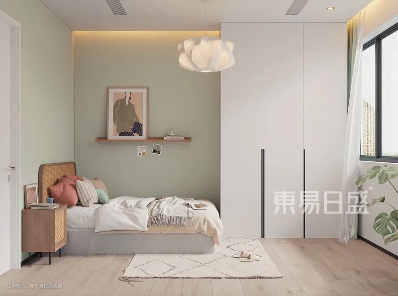次卧的色调也清新,墙面以浅绿色为主,一眼望去素雅干净,搭配木制干板和装饰画呈现温馨静谧的睡眠空间,一字柜做通顶设计,最大化利用垂面空间,增加储物功能。