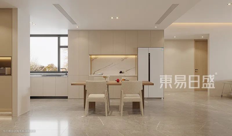 餐厅空间做开放式布局,动线更加舒适合理。地面延续了浅灰色的纹理地砖,大气利落。靠侧墙做整体橱柜,通顶的柜体最大化利用垂面空间,同时中间掏空做西厨操作台,提升空间利用率。