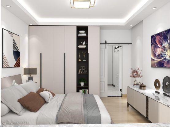 床尾空间比较宽裕,我们定制了悬空电视+电视柜的组合,加上精致的摆饰,打造出卧室惬意的一角。