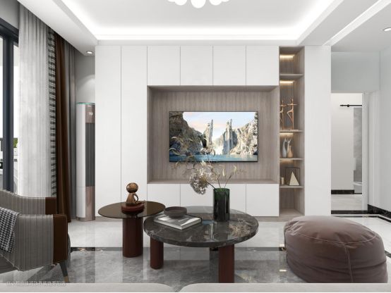 电视墙则形成内退的结构,周围一圈收纳展示柜,增加空间的可延续使用性。