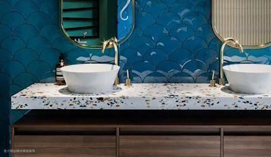 三、水磨石:水磨石是将玻璃、碎石等等拌入水泥中表面进行抛光打磨的复合地面装饰材料,可能大多数人不是太了解,就想想小学时候的地板吧,地面上有很多小碎石装饰就是水磨石的。除此之外,还耐磨耐脏造价要比大理石的成本低很多。现在水磨石是时尚设计师的心头爱,打造复古时尚风的利器。而且水磨石具有一定的吸水防滑效果,用在卫生间可谓是相当合适了。水磨石的颜色丰富多样,一般都是白色打底,有多种颜色,可以根据自己喜欢的颜色选择延申到台面,进行呼应,效果也是一级棒