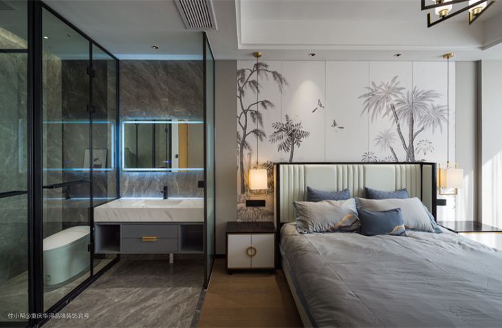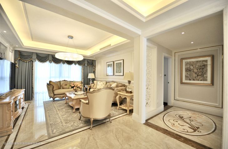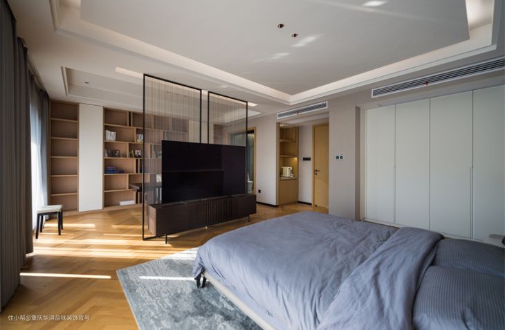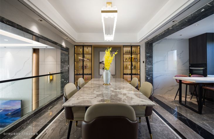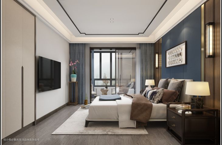 设计师为增加层次感,宽边双眼皮吊顶时在贴着楼板的地方增加两层薄薄的回字纹造型,丰富了吊顶的层次和美观性。