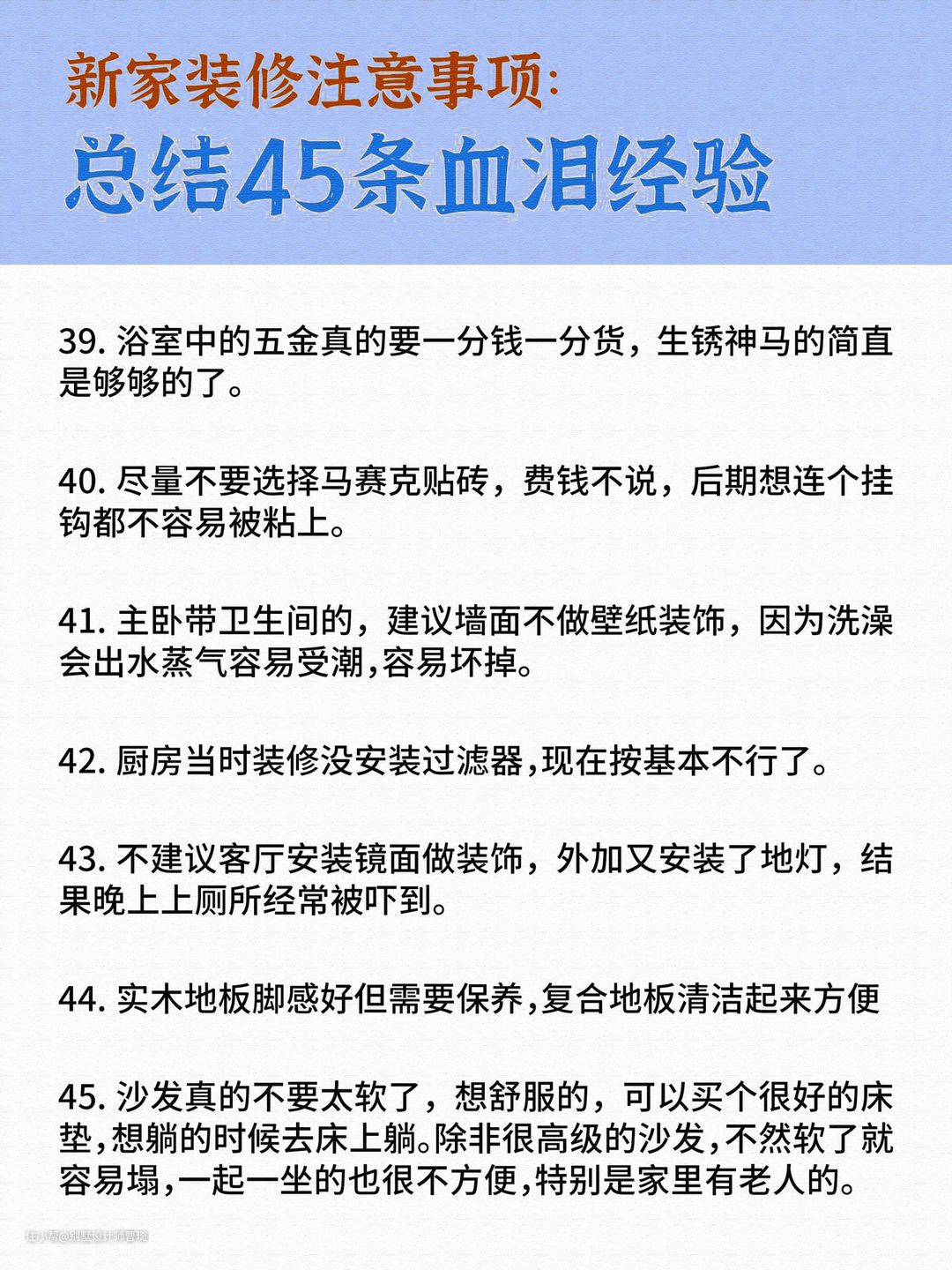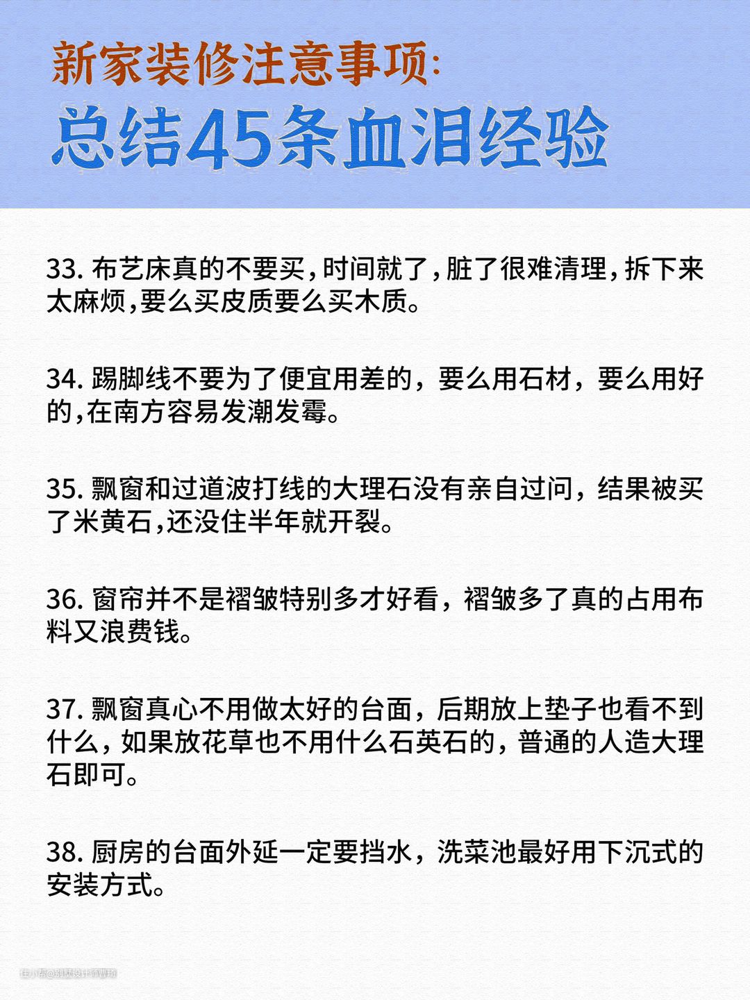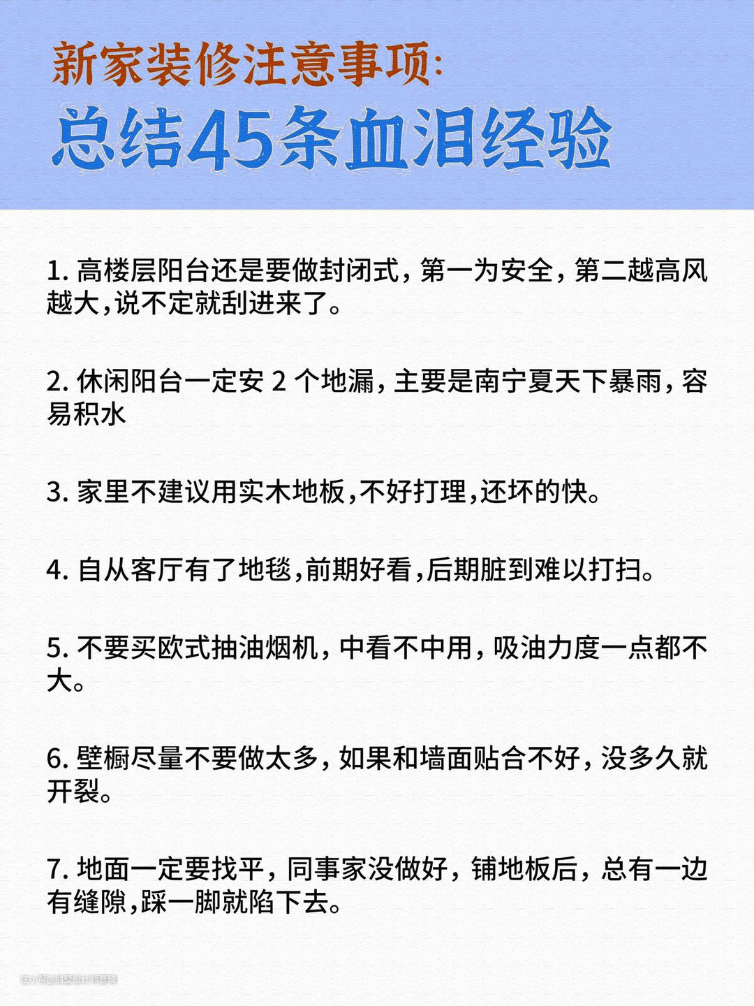 新房装修总结45条别墅设计师曹琦2022-06-26新房装修总结45条。每一条都是来自一线的经验总结。除了内容的建议,昂品还给大家整理了一份资料关于《装修基础知识》,包含报价、设计、做预算、签合同等,特别容易踩坑的点入手,评论区发“装修”领取。