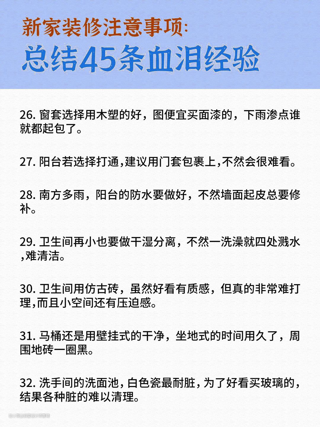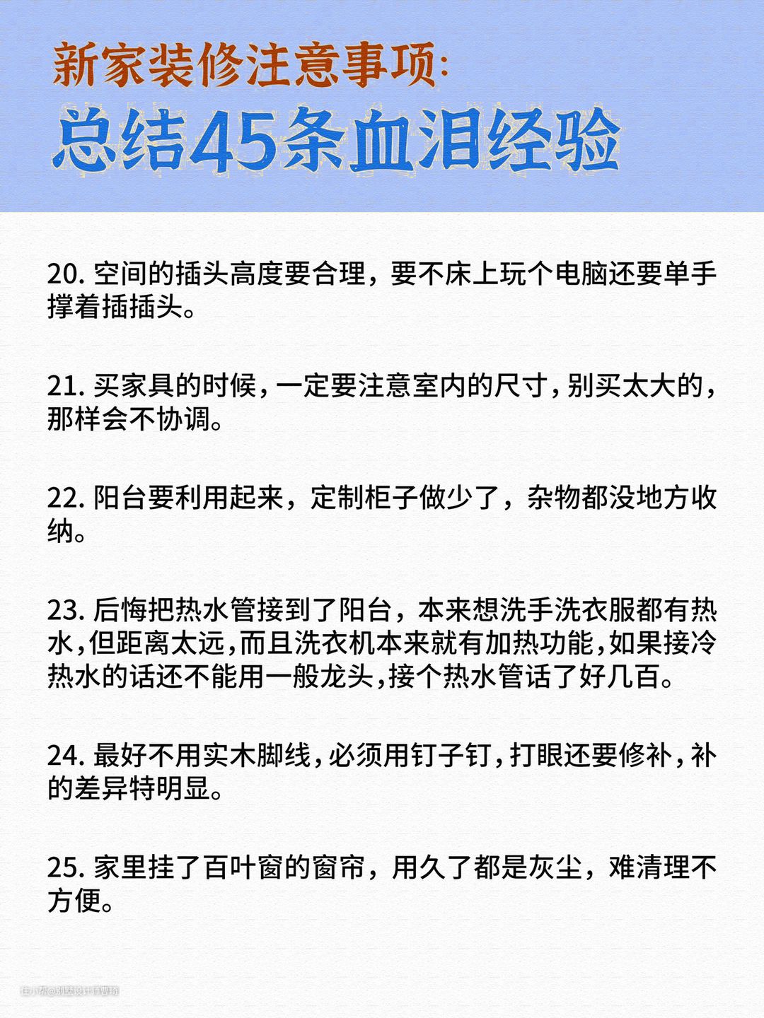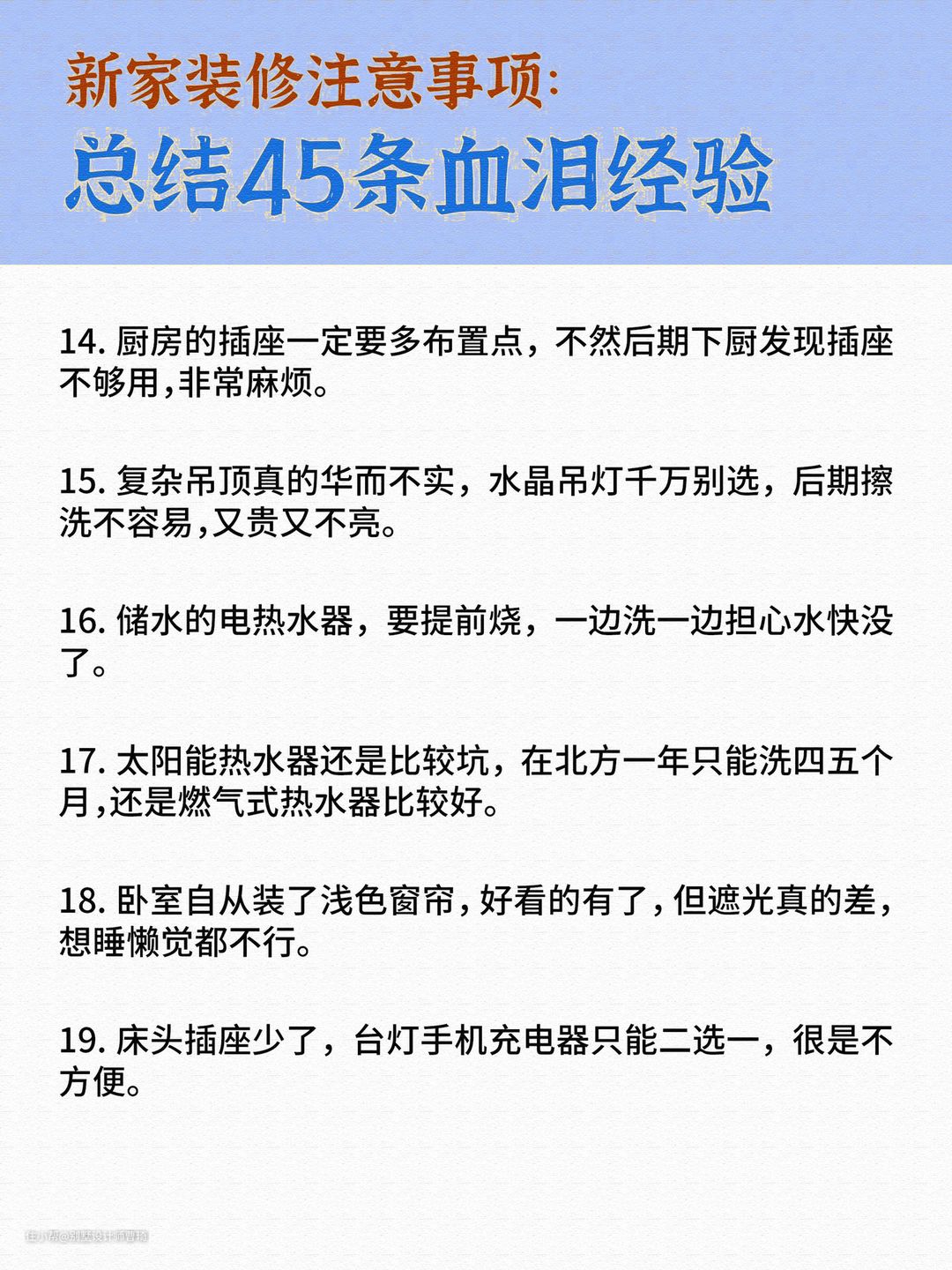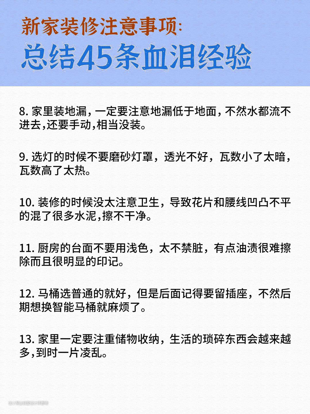 新房装修总结45条别墅设计师曹琦2022-06-26新房装修总结45条。每一条都是来自一线的经验总结。除了内容的建议,昂品还给大家整理了一份资料关于《装修基础知识》,包含报价、设计、做预算、签合同等,特别容易踩坑的点入手,评论区发“装修”领取。