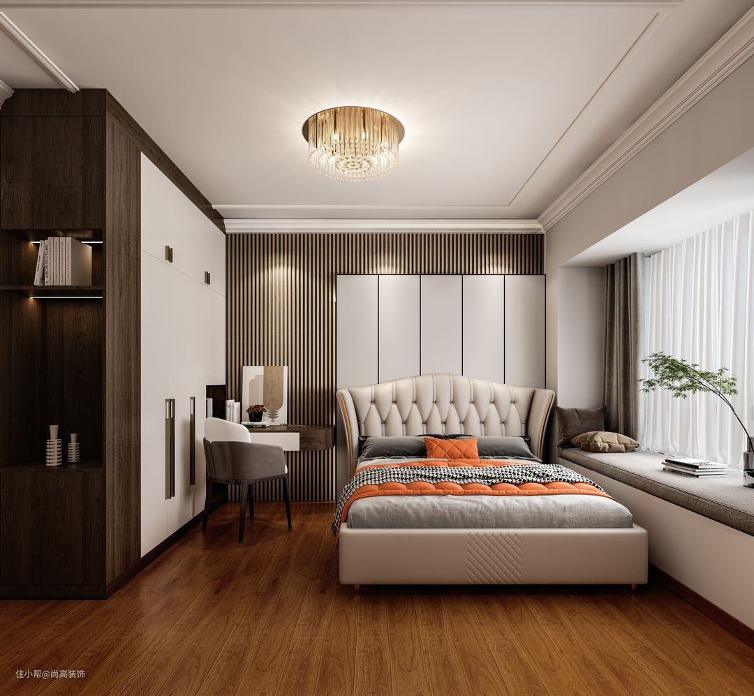 第一个是稳重的主人卧室,中性色的装饰为这间卧室带来质感上的飞跃。 上乘的木质衣柜凸显高级感、高效而富有创意的饰面为房间增添了温文尔雅的感觉,所以,主人卧室的特点一般是气质和品味,只要这两项感觉能够驾驭住了,主人房的主人才不会有失身份。