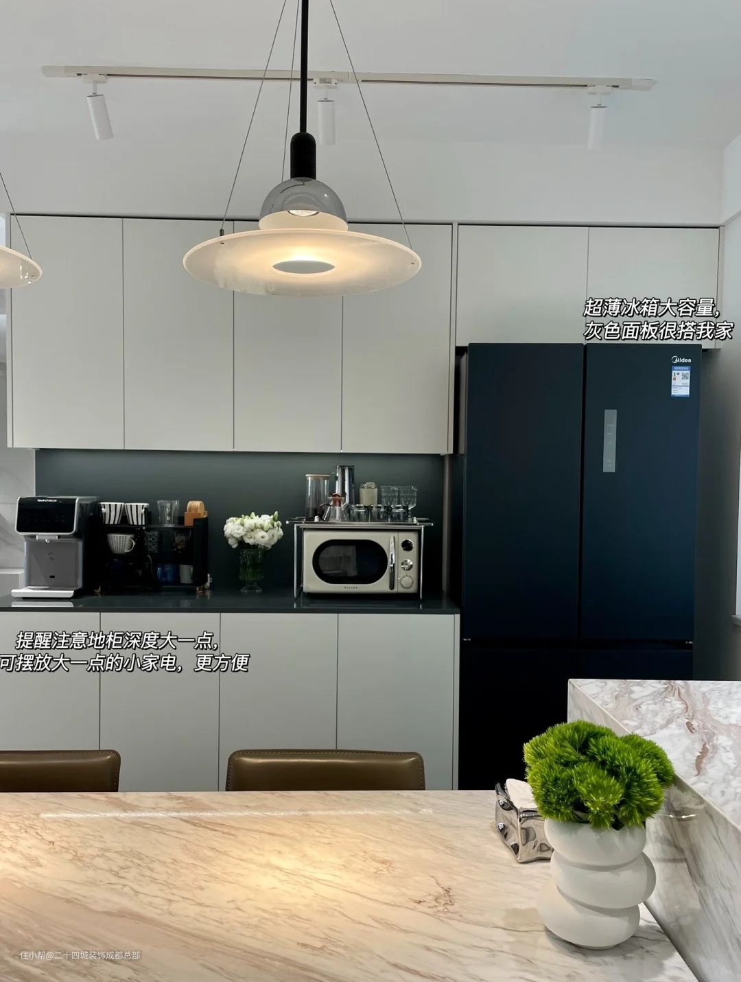由于厨房长度不厚,放不下双开门冰箱,所以干脆把冰箱放餐厅,不用担心走动不方便,刚好有个岛台,收拾拿取都很方便~