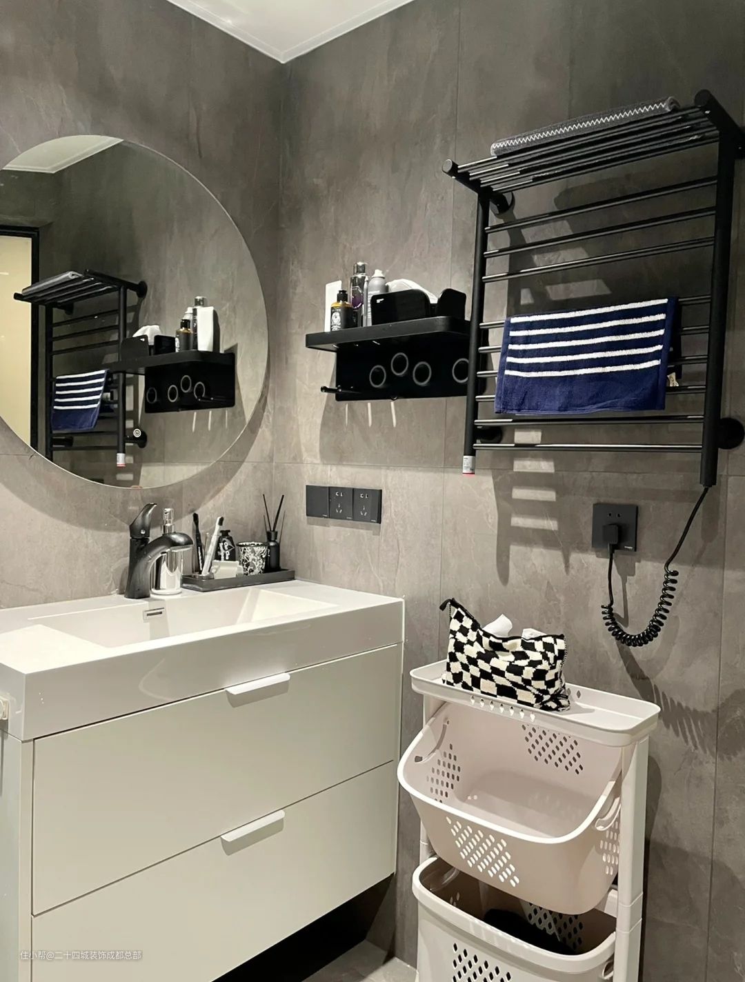 屋主很喜欢就酒店式的装修,看起来高级感又整洁舒适~没有过度的收纳,没有过多的颜色,于是卫浴空间在硬装上整体的大基调是灰色➕黑色,大面积的瓷砖用的是1.2米大砖上墙,减少美缝线条,看起来真的会很大气,其他五金同样也是黑色或者灰色,深色系的东西,往往都是充满高级感和质感。