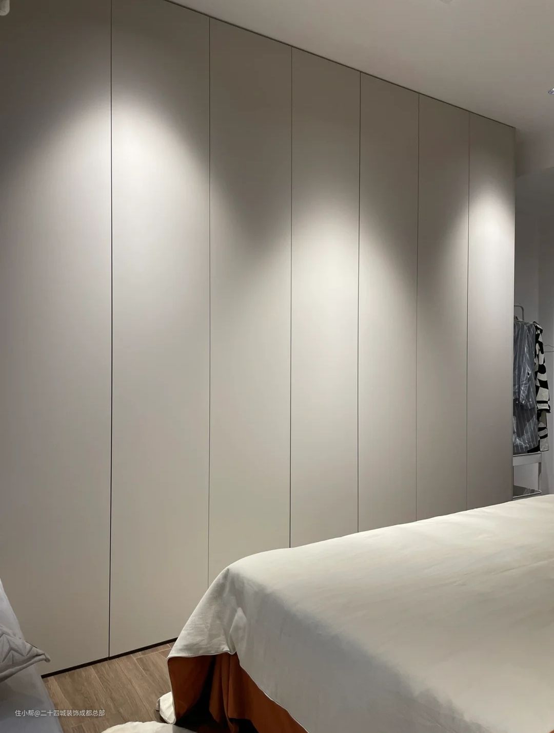 原设计的床侧衣柜只有2米而且只能放1.5米的床,所以改床尾衣柜,改了以后就可以放1.8的床啦~现在床尾衣柜有3.2长,收纳能力增加一倍!床尾过道55cm完全可以正常行走,柜门一门到顶设计,视觉形同护墙板,让整面墙柜子也不觉得压抑~