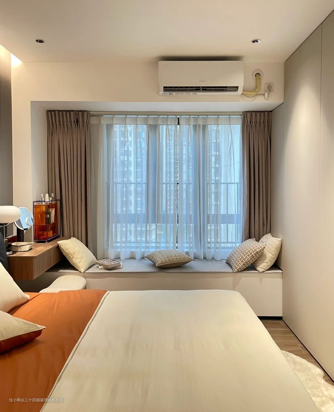 卧室放上1.8米的床基本都没啥位置了,就不打算两边放床头柜~一边暂时放床头柜,这个位置以后还可以拼接婴儿床,一边利用扇窗位置做了梳妆台更加实用!长1m(利用飘窗40cm,走廊60cm)深度45cm,厚度20cm,离地高度80cm,可以轻松放进梳妆凳~