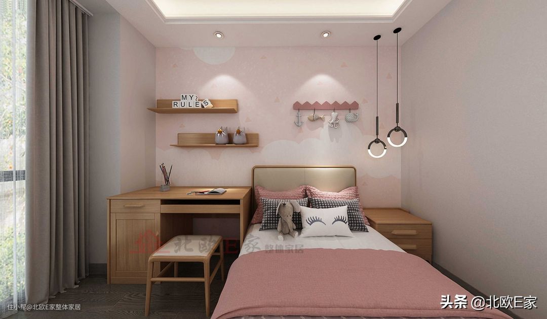 女儿房使用亮粉色的床品搭配米黄色的床让空间的氛围更为活跃。床头的书桌也可做梳妆台。