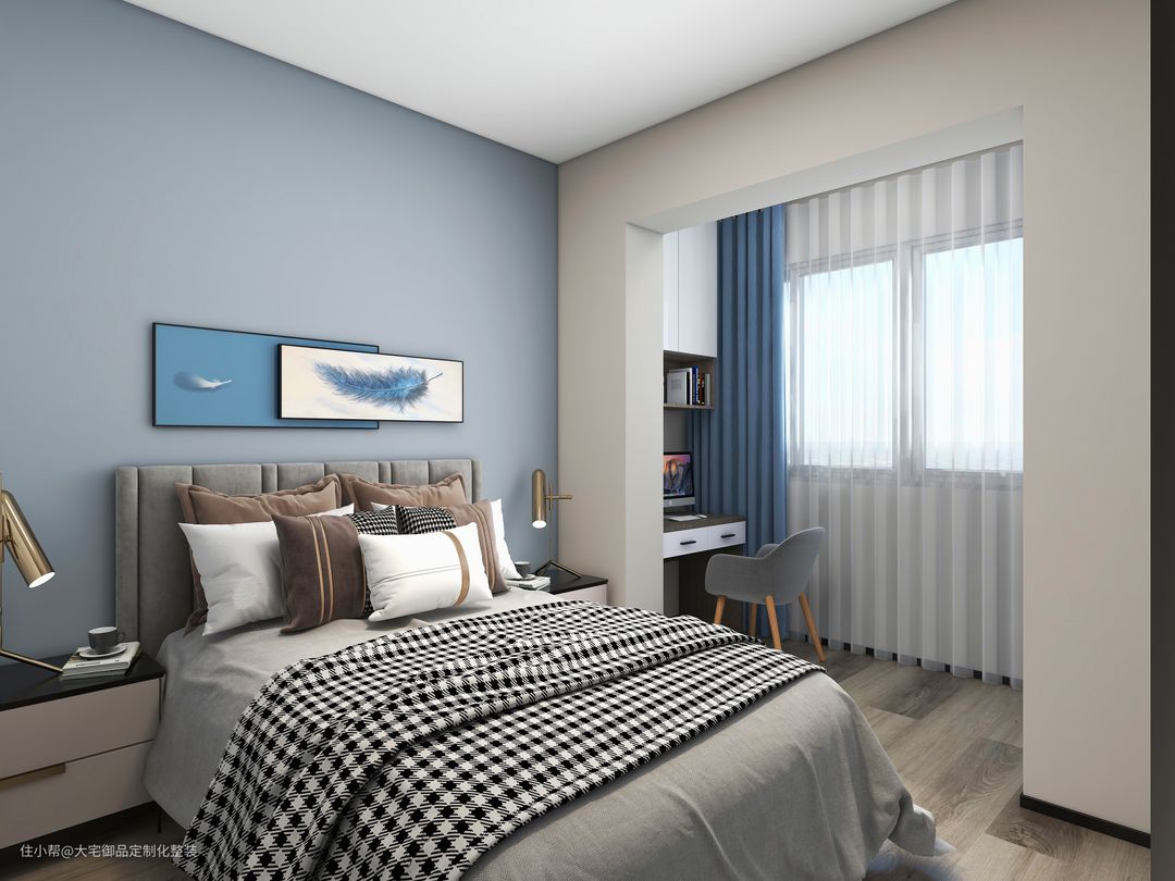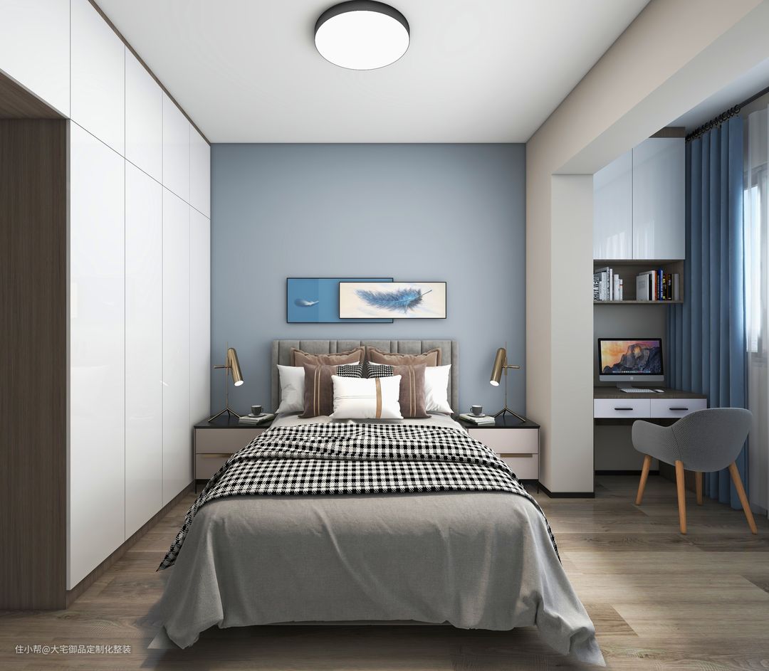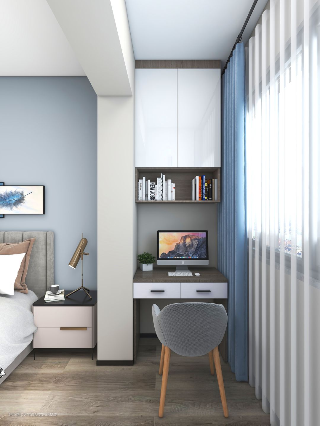 书桌对面也有收纳点,整个卧室的收纳功能非常强,分区分明;床头柜可以摆放艺术品或者其他的小物品。