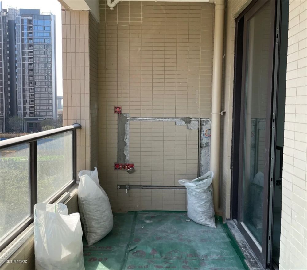 她先是进行了改水改电,而后又重新在阳台做了防水,为了节省预算,墙面砖被尽可能保留下来,毕竟按照后续的设计,这面墙是要安装一整组的柜子,也能起到遮挡的作用。